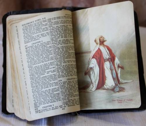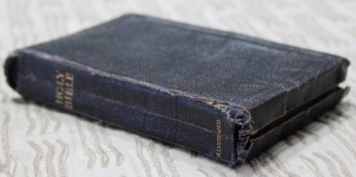 THIS LOVELY POCKET SIZED ILLUSTRATED ENGLISH KING JAMES HOLY BIBLE IS IN GOOD CONDITION FOR ITS AGE AND HAS BEEN PERSONALISED DATING BACK TO 1944. THE BIBLE HAS THE OLD AND NEW TESTAMENTS. THE BIBLE HAS SOME AGE AND USAGE RELATED WEAR AND TEAR AND MEASURES 14cm LONG X 10cm WIDE. PLEASE VIEW THE PICS CAREFULLY TO FULLY APPRECIATE THIS LOVELY ILLUSTRATED KING JAMES BIBLE AND TO CONFIRM THE CONDITION.