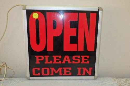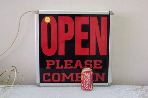 THIS AWESOME BLACK AND RED "ILLUMINATING" AND WORKING "OPEN - PLEASE COME IN WALL SIGN" MEASURES 45cm x 45cm x 9cm DEEP AND IS IDEAL AS EITHER A WALL MOUNTED SIGN OR A WINDOW "HANGING" SIGN. THE SIGN USES TWO LOW VOLTAGE GLOBES. THE SIGN DOES NEED A WALL PLUG.