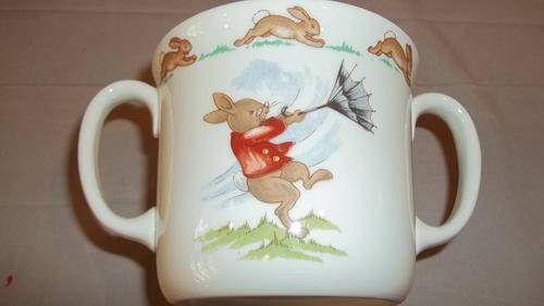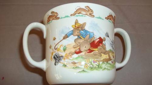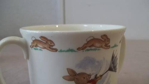 THIS STUNNING AND VERY COLLECTABLE VINTAGE ROYAL DOULTON PORCELAIN BUNNYKINS SERIES DOUBLE EARED CUP IS IDEAL FOR YOUNG CHILDRENTHE CHINAWARE LINE ORIGINATED WITH ARTWORK BY MARY BARBARA BAILEY, THE DAUGHTER OF CUTHBERT BAILEY, THE GENERAL MANAGER OF DOULTON DURING THE 1930's. UNBEKNOWNST TO THE PUBLIC, MARY BARBARA BAILEY WAS NOT A PROFESSIONAL ILLUSTRATOR, BUT A NUN IN THE AUGUSTINIAN CANONESSES OF THE LATERAN. INTRODUCED IN 1934, BUNNYKINS TABLEWARE DEPICTED MR. AND MRS. BUNNYKINS AND OTHER RABBITS DRESSED IN HUMAN CLOTHING, IN COLOURFUL RURAL AND SMALL-TOWN ENGLISH SCENES, TRANSFER-PRINTED ON WHITE CHINA. THE BOWL IS IN GREAT CONDITION WITH NO CHIPS OR CRACKS WITH MINIMAL AGE AND USAGE RELATED WEAR AND TEAR.