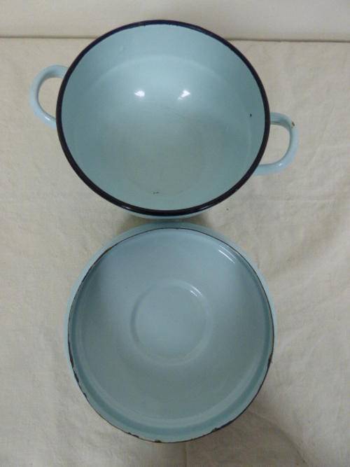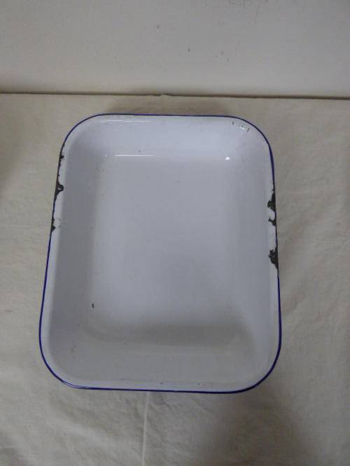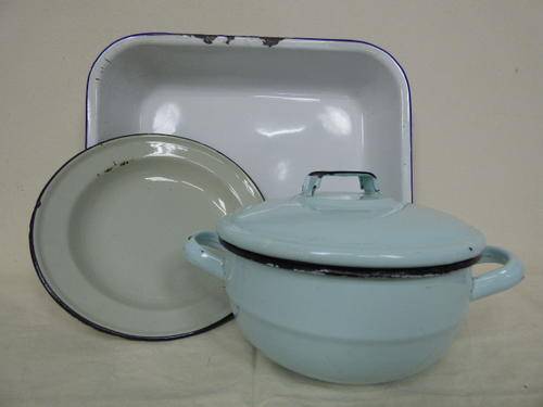 THIS FANTASTIC "LOT" OF ENAMELWARE PIECES HAVE LOADS OF CHARACTER AND CHARM. THE COLLECTION INCLUDES A LARGE MEAT DISH, LIDDED POT/ SERVING BOWL AND A PLATE. THESE ITEMS HAVE AGE AND USAGE RELATED WEAR AND TEAR, BUT IT'S WHAT GIVES THESE AMAZING OLD ENAMELWARE PIECES THEIR CHARACTER AND CHARM. THESE ITEMS ARE PERFECT TO HAVE AROUND THE BRAAI AREA OR IN YOUR LAPA. PLEASE VIEW THE PICS CAREFULLY FOR THE GENERAL CONDITION.