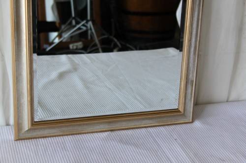 THIS AWESOME FULL LENGTH "BEVELED GLASS" WALL MIRROR WITH A BEAUTIFUL ANTIQUE GOLD (WITH SILVER OVER TONE) COLOUR FRAME MEASURES 490mm AGROSS x 1385mm HIGH. THE MIRROR IS IDEAL FOR A BEDROOM/ WALK IN CLOSET OR EVEN AS A HALLWAY MIRROR OR ENTRANCE HALL MIRROR. THE BACK OF THE MIRROR HAS TWO BRASS CLIPS TO HANG IT ON THE WALL. THE FRAME IS IN GREAT CONDITION WITH ABSOLUTE MINIMAL SCUFFS; NOTHING A LITTLE TLC CAN'T SORT OUT. PLEASE VIEW THE PICS CAREFULLY TO FULLY APPRECIATE THIS AWESOME MIRROR AND TO CONFIRM THE CONDITION.
