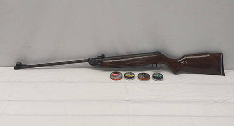 This awesome Industry Brand "Break Barrel" model B2-2A Air-rifle with an assortment of metal pellets is in good condition and is in working order. The Air-rifle is in a canvas carry bag (Zipper broken) and has four tins of assorted Gamo metal pellets. There is a little surface rust on the barrel, but a good cleaning and service will get this Air-rifle in tip top condition.