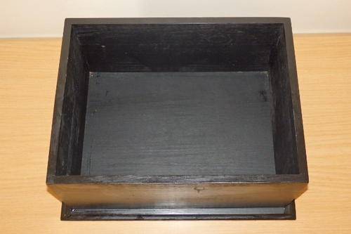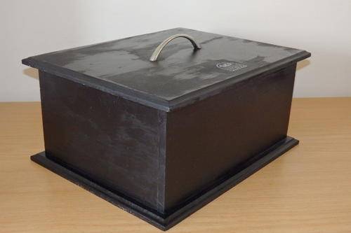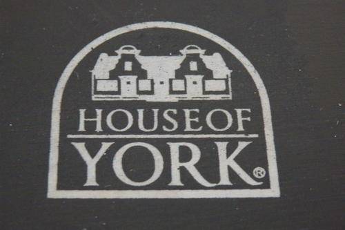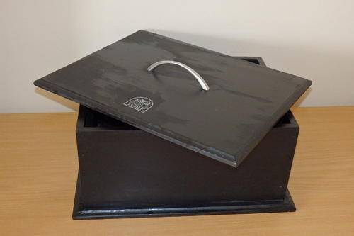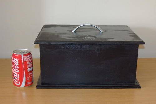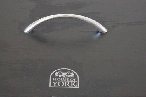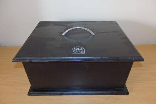 THIS AWESOME "LARGE" HOUSE OF YORK WOODEN LIDDED BOX IS IN A STUNNING DARK EBONY STAIN AND JAS A STEEL HANDLE. THE BOX IS IN GREAT CONDITION AND ID IDEAL TO USE EITHER IN THE KITCHEN, GARAGE, HOBBY ROOM AND JUST ABOUT ANYWHERE WHERE YOU NEED TO STORE ITEMS. THE BOX IS 34cm LONG x 26.5cm WIDE x 18cm HIGH INCLUDING THE HANDLE. THERE HAVE BEEN A FEW STAIN TOUCH-UPS.