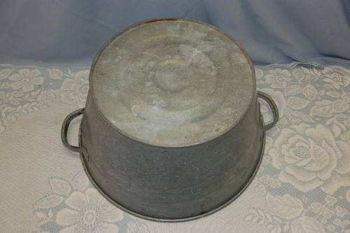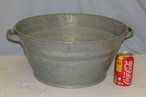 THIS AWESOME LARGE ROUND DOUBLE HANDLED VINTAGE GALVANISED BASIN IS IN GOOD CONDITION AND MEASURES 47.5cm ACROSS (HANDLE TO HANDLE), 42cm WIDE x 19cm TALL. THESE BASINS ARE ALSO IDEAL FOR A DRINKS COOLER AS WELL AS FOR POTTED PLANTS ETC. THERE IS MINOR AGE AND USAGE RELATED WEAR AND TEAR.