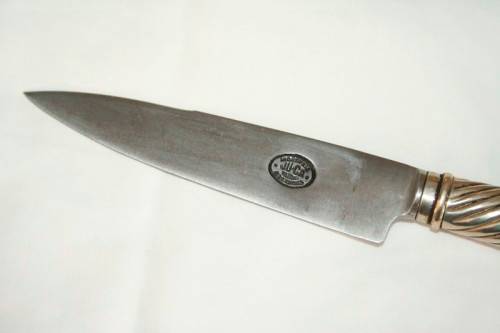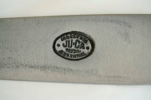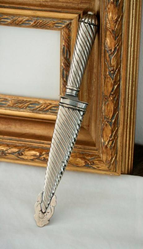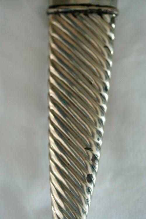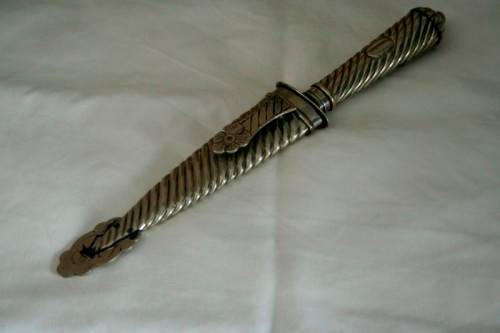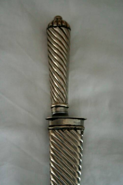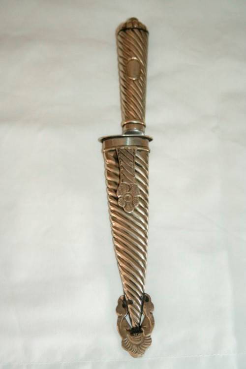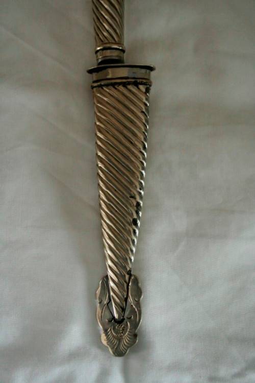 This awesome ornate original vintage Argentinian Alpaca silver metal "Gaucho" (cowboy) boot knife in it original metal sheath is in good condition and has stunning hand chased and repousse detailing on both the knife handle and the sheath. This traditional South American cowboy knife has an overall length of 24.5cm in the sheath, with a knife length of 21.5cm with a blade length of 12cm. These amazing knives are hand forged and beautifully made. The knives were also used as fighting knives and were work in the small of ones back, attached to the persons belt. Please view the pics carefully to fully appreciate this awesome traditional Argentinian cowboy knife and to confirm the condition.