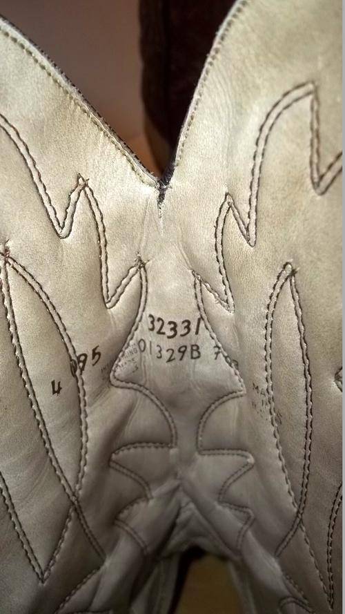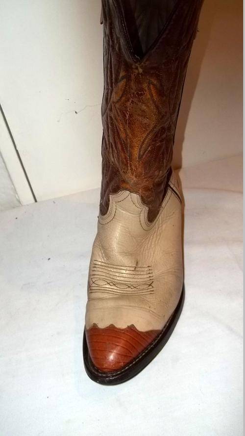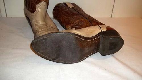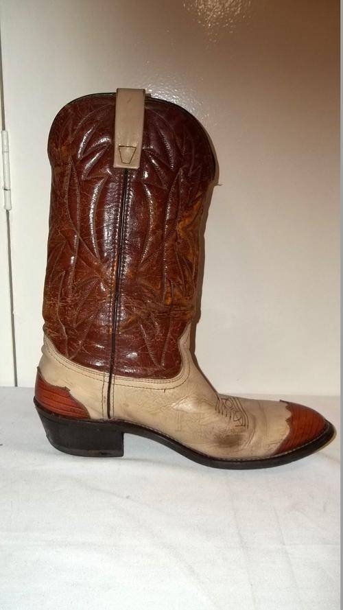 THIS AWESOME PAIR OF AUTHENTIC COWBOY BOOTS ARE MADE IN THE USA AND ARE THE R-TIP STYLE BOOTS WITH STITCHED DETAILING ON THE BOOT. THE BOOT IS A CREAM AND BROWN LEATHER WITH LEATHER SOLES. THERE HAS BEEN USAGE WEAR AND TEAR, BUT THEY ARE STILL PRETTY AWESOME.