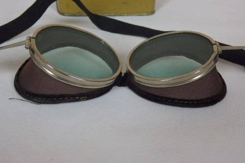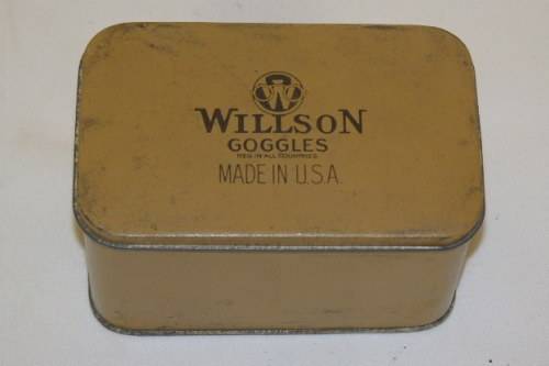 THIS AWESOME PAIR OF VINTAGE USA MADE "WILLSON GOGGLES" AVIATOR/ MOTORCYCLE GOGGLES ARE STILL IN THEIR ORIGINAL METAL BOX AND ARE IN FANTASTIC CONDITION WITH ABSOLUTE MINIMAL AGE AND USAGE RELATED WEAR AND TEAR. THE GOGGLES HAVE A CHROMED METAL CASE WITH GREEN LENSES AND FABRIC EYE COVERS AND AN ELASTICIZED HEAD BAND. THE GOGGLES FOLD AWAY TO FIT PERFECTLY INTO THEIR TIN BOX. WHAT AN AWESOME FIND!!! THIS WOULD ALSO BE AWESOME FOR YOU HARLEY GUYS OR GUYS INTO STEAM-PUNK ATTIRE.