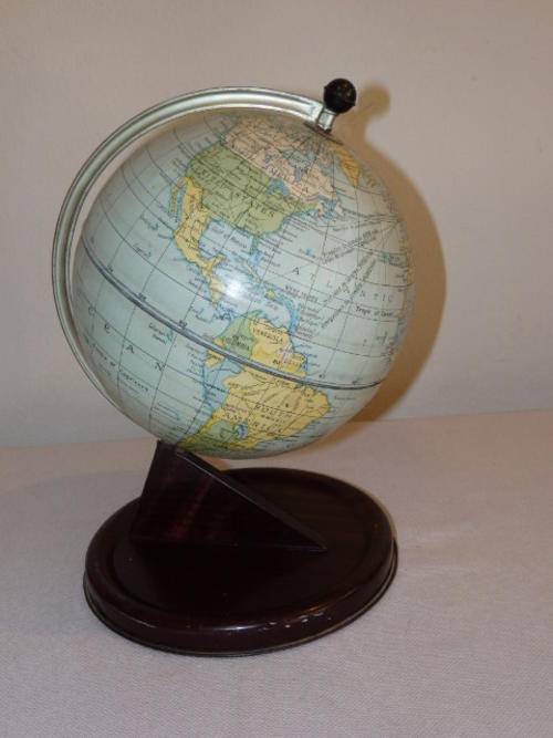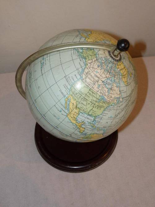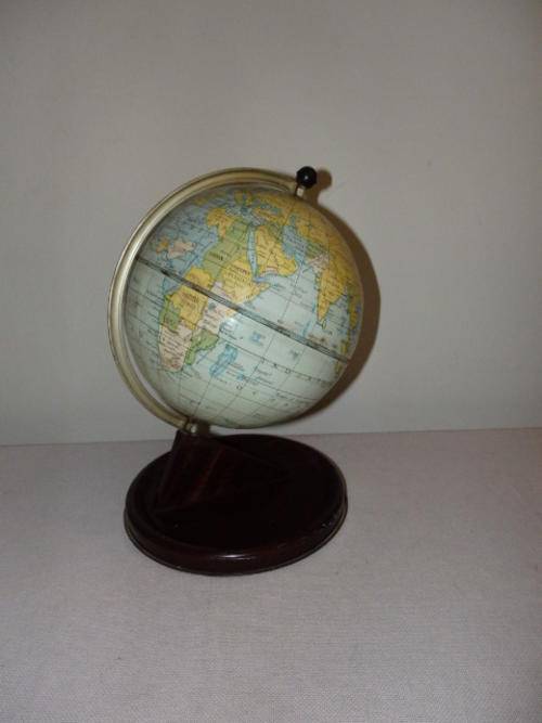 THIS AWESOME WORLD GLOBE MEASURES 26cm TALL AND IS ON A WOOD EFFECT METAL BASE. THE GLOBE IS IN GREAT CONDITION AND A GREAT PIECE FOR A STUDY.