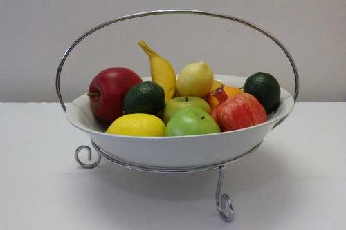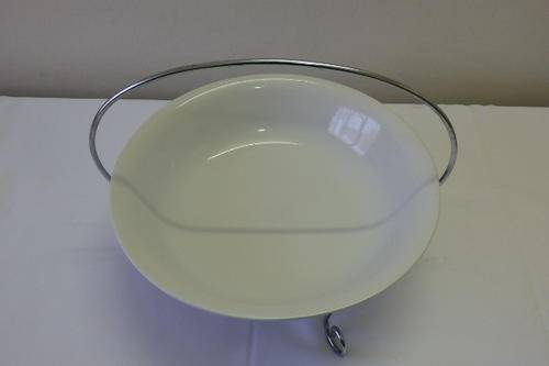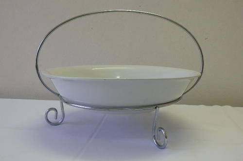 THIS AWESOME ROUND WHITE CERAMIC SERVING BOWL IN A CHROMED METAL "CARRY" STAND IS IN GREAT CONDITION WITH MINIMAL USAGE RELATED WEAR AND TEAR. THE BOWL IS THE PERFECT FRUIT BOWL, OR FOR SALADS ETC. THE BOWL MEASURES 32cm ACROSS x 7.5cm HIGH AND THE STAND IS 35cm ACROSS x 25cm HIGH. PLEASE NOTE THE FRUIT IS NOT INCLUDED.