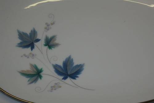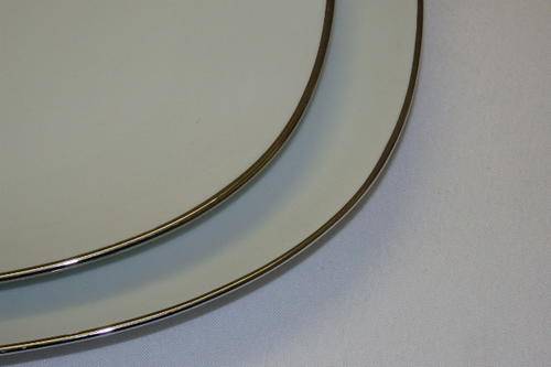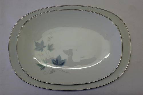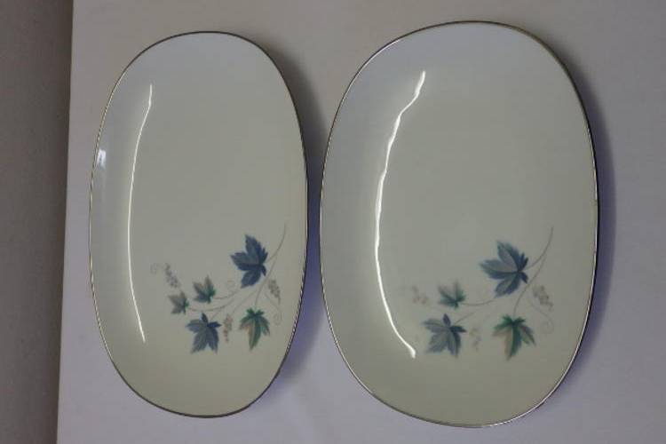 THIS STUNNING "ROYAL CERAMICS" BY NORITAKE OF JAPAN "VINTAGE SERIES" PATTERN NUMBER 618, SET OF 2 SERVING PLATTERS MEASURE AS FOLLOWS: THE SMALLER PLATTER IS 28.8cm LONG x 20.5cm WIDE AND THE LARGER PLATTER IS 33.8cm LONG x 23.5cm WIDE. THE EXQUISITE CRISP WHITE OF THE CHINA HAS BEEN BEAUTIFULLY FINISHED WITH SILVER GILDING AND A PATTERN WITH SOFT GREY AND GREEN LEAVES WITH SWIRLS. THERE ARE ABSOLUTELY NO CHIPS OR CRACKS IN THE PORCELAIN AND THE SET DOES NOT EVEN LOOK AT THOUGH IT WAS EVER USED. ALTHOUGH THE BACK STAMP DOES NOT SAY NORITAKE, I BELIEVE THAT "RC" ROYAL CERAMICS FALLS UNDER THE NORITAKE BANNER. PLEASE NOTE THAT YOU ARE BIDDING PER PLATTER TO TAKE THEM BOTH.