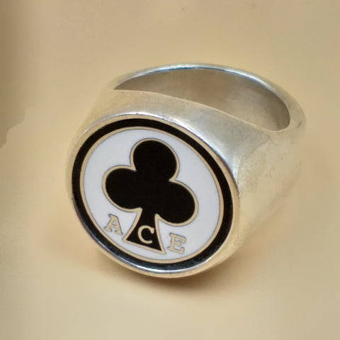 This awesome sterling silver Bikers ring with a black and white "Ace of Clubs" enamelled face is a gents size Q and weight a very decent 25.4g. The silver ring is in good condition. The ace of clubs symbolizes the contract that the biker has with his club.