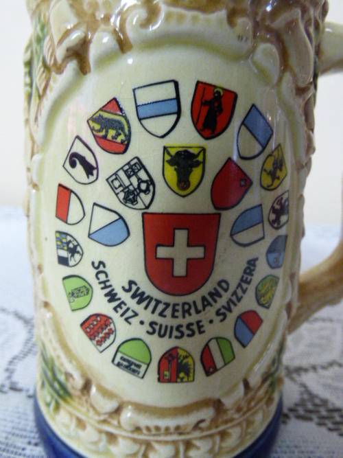 AN AWESOME COMMEMORATIVE BEER MUG OF SWITZERLAND. THIS BEER MUG HAS NO DAMAGE TO IT AND IS IN VERY GOOD CONDITION. IT STANDS 13cm HIGH. DEFINITELY ONE TO ADD TO YOUR COLLECTION OR STAND IN YOUR PUB.