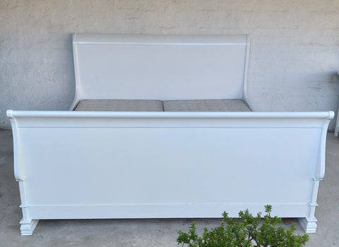 This awesome and well made large king-size white painted sleigh bed includes the base set (two single bed bases) and measures as follows: 191cm long across the front x 210cm wide x 113cm high and the mattress size (internal measurements) are 184.5cm at the front x 192cm. The bed is in good condition and is a well made sturdy sleigh bed. As with all used furniture there is minor usage wear. This is a stunning solid bed to have in main bedrooms, guest rooms or holiday homes. One needs to get a mattress for this bed. Please view the pics as they form part of the description.
