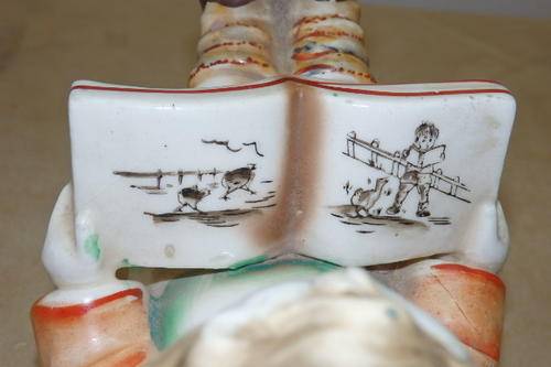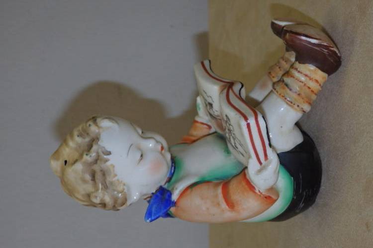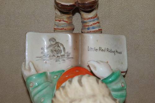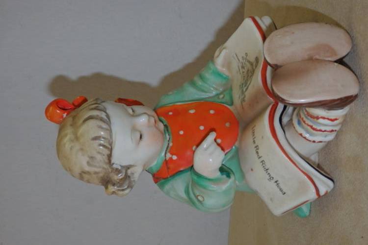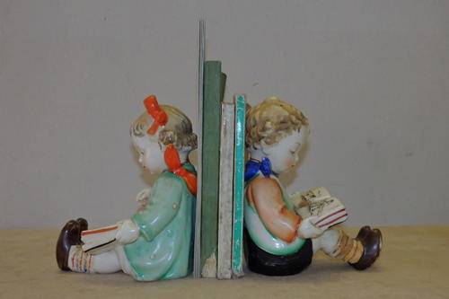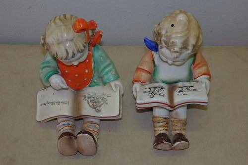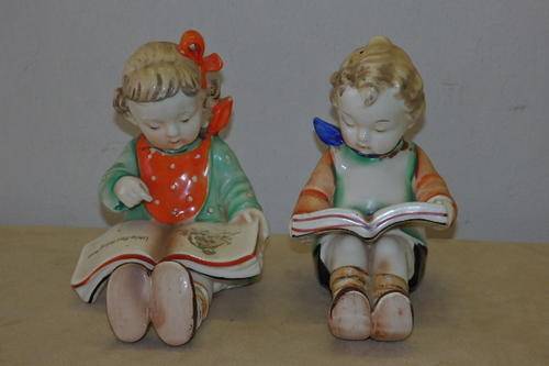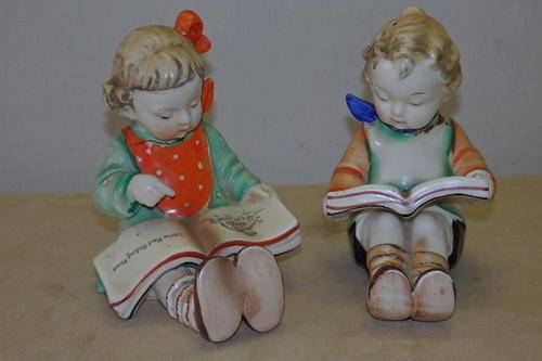 THIS AWESOME HAND PAINTED VINTAGE (1950's) PORCELAIN "BOOKENDS" FIGURINE SET OF CHILDREN READING PICTURE BOOKS WERE MADE IN JAPAN AND WERE INSPIRED BY THE HUMMEL BOOKEND FIGURINES OF THE 1920's. THE FIGURINES MEASURE ROUGHLY 14.5cm TALL x 11.5cm LONG AND ARE IN GREAT CONDITION WITH ABSOLUTE MINIMAL AGE AND USAGE RELATED WEAR AND TEAR. THERE IS EVIDENCE OF AGE RELATED CRAZING WHICH ADDS TO THE APPEAL OF THIS BOOKEND SET. THEY ARE PERFECT FOR A KIDDIES ROOM.