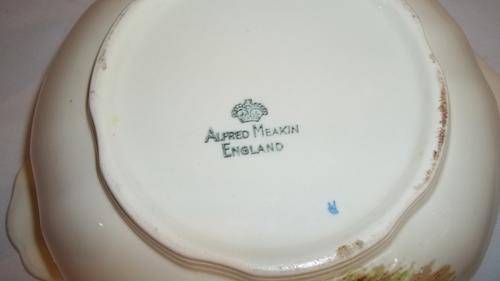 THE STUNNING VINTAGE PORCELAIN "HAYRIDE" SERIES BY ALFRED MEAKIN OF ENGLAND WAS INTRODUCED IN THE LATE 1940's AND INTO THE 1950's (CONFIRMED BY THE HALLMARK). THE SET HAS SEEN SOME AGE AND USAGE RELATED WEAR AND TEAR AND THERE IS CRACKLING ON MANY OF THE PIECES, BUT IT ADDS TO THE APPEAL AND BEAUTY OF THIS TRULY AMAZING PATTERN. THE SET HAS NO CHIPS OR CRACK (UNLESS WHERE SPECIFICALLY LISTED).