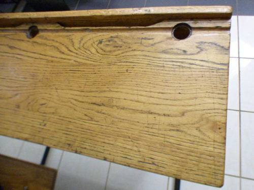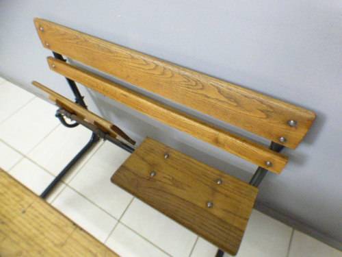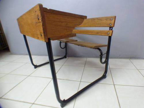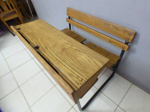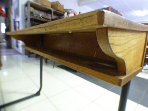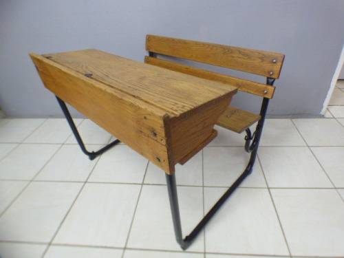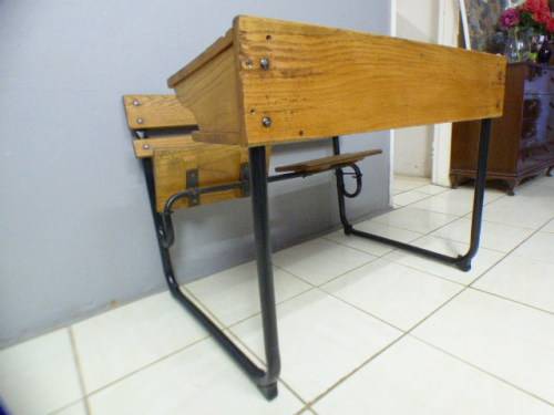 This awesome vintage/ antique? solid teak two seater school desk is in wonderful condition and has a sturdy metal frame and a storage shelf below the writing top. These old school desks are becoming more and more scarce so if you do not have one, now is your chance!!! The size of the desk 85cm x 107cm x 82 cm high. They are perfect for a child's play room or bedroom or even as a feature piece in a living area. There is normal age and usage related wear and tear. Please view the pics carefully to fully appreciate this fabulous old school desk and to confirm the condition.