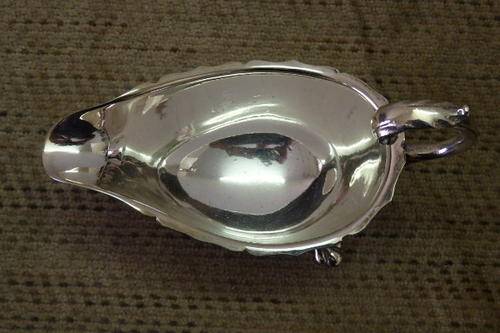 AN AWESOME VINTAGE EMESS FOOTED EPNS SILVER PLATED "PLATED" GRAVY BOAT WITH AN UNUSUAL HANDLE