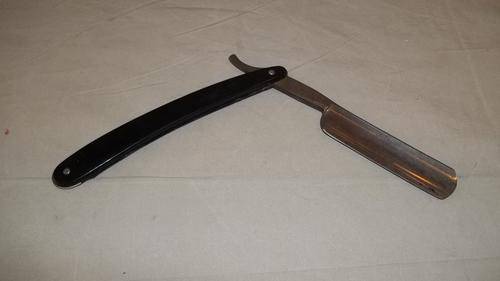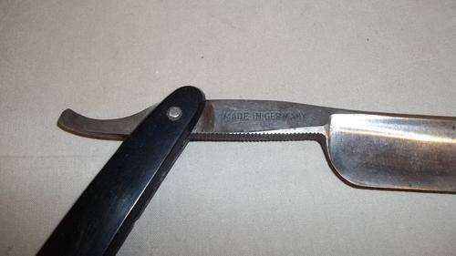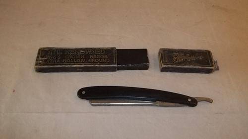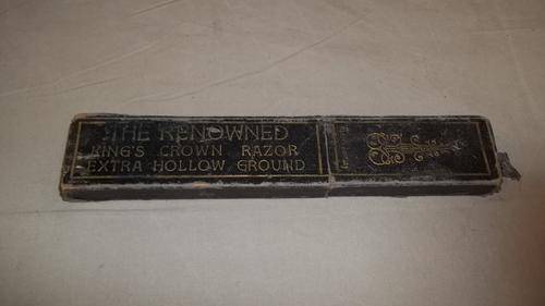 THIS AMAZING VINTAGE GERMAN MADE CUT-THROAT RAZOR IS IN IT'S ORIGINAL BOX. THE BOX HAS "THE RENOWNED KING CROSS RAZOR" AND" EXTRA HOLLOW GROUND" ON IT. THE RAZOR WITH A BLACK HANDLE MEASURES 16cm CLOSED AND 24.5cm OPEN. THERE IS AGE AND USAGE RELATED WEAR AND TEAR ON BOTH THE BOX AND RAZOR. THIS IS AN AMAZING CUT-THROAT.