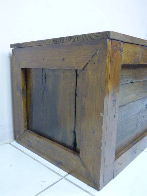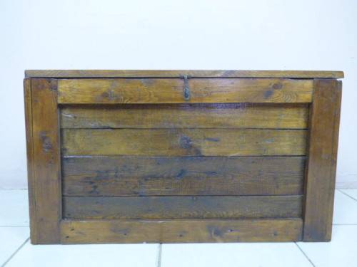 THIS AWESOME WOODEN STORAGE BOX WITH A HINGED LID IS THE IDEAL TOY BOX AS WELL AS A KIST FOR LINEN OR COLLECTABLES ETC. THE BOX MEASURES 54cm x 89cm x 51cm HIGH. THE BOX CAN BE REPAINTED TO SUITE YOUR REQUIREMENTS AND WOULD BE A FANTASTIC SHABBY CHIC PIECE. THERE IS A LITTLE AGE AND USAGE RELATED WEAR AND TEAR, BUT IT ADDS TO THE CHARM OF THIS GOOD SIZE STORAGE BOX. THIS BOX IS A NICE SIZE AND WILL MAKE ALOVELY COFFEE TABLE INAN INFORMAL LIVING AREA.