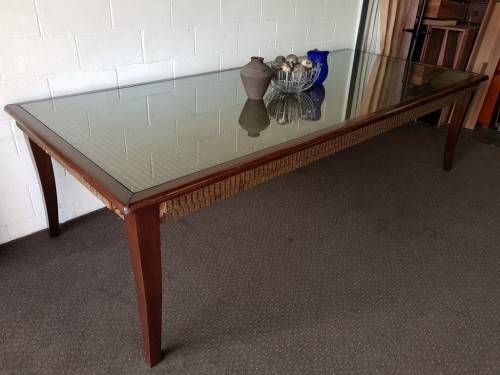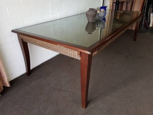 This awesome 10 to 12 seater solid Mahogany and wicker dining table with a thick and heavy glass top is in good condition with some/ normal age and usage related wear and tear. The table measures a VERY decent 300cm long x 129cm wide x 81cm high. The table is very well made and sits well on the floor. There are some scuffs and marks on the wood and glass surface of the table (see pics) but it is not hugely noticeable. You will struggle to find a table more perfect for large family gatherings! Please view the pictures carefully to fully appreciate this awesome large dining table and to confirm the condition.