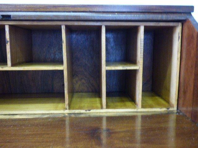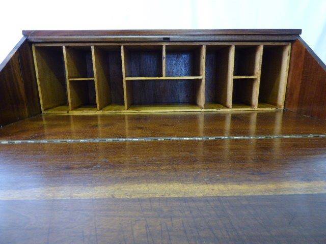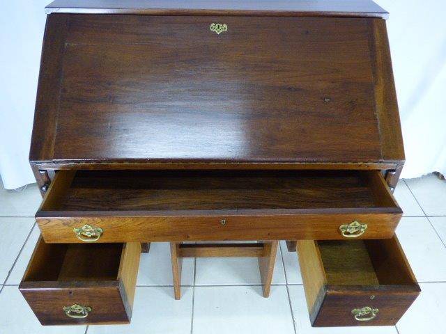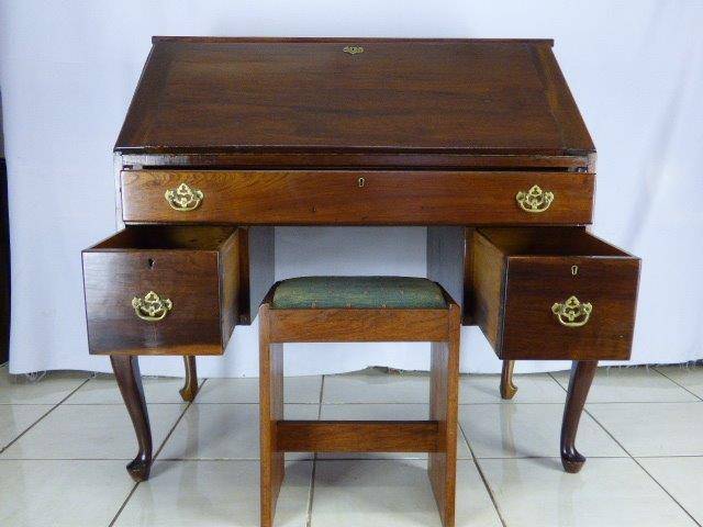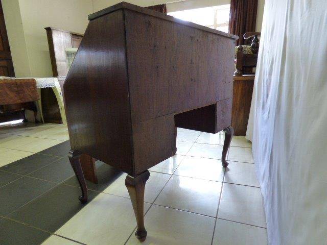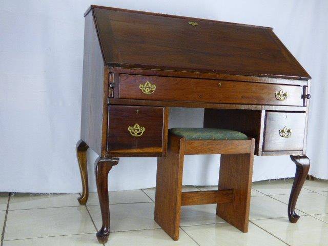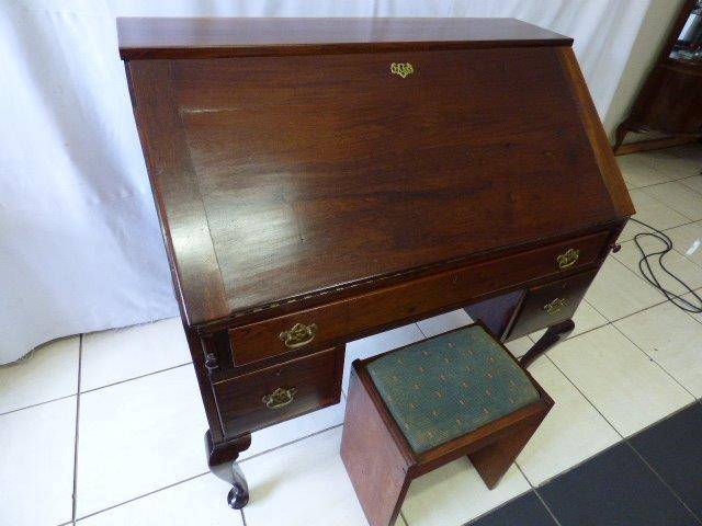 AN EXQUISITE ANTIQUE QUEEN ANNE WRITING BUREAU IN EXCELLENT CONDITION. THIS BEAUTIFUL QUEEN ANNE BUREAU IS MADE OF SOLID TEAK AND HAS A LOVELY STOOL FOR YOUR ADDED COMFORT, A BEAUTIFUL PIECE OF FURNITURE TO HAVE IN YOUR HOME, STUDY OR OFFICE. THERE IS LOADS OF STORAGE SPACE IN THE DRAWS AND INSIDE, THIS EXQUISITE BUREAU MEASURES 64cm x 110cm x 108cm HIGH.