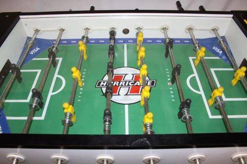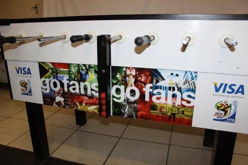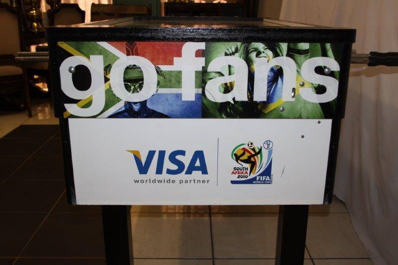 AN EXCEPTIONAL UNION BILLARDS "HURRICANE" 2010 WORLD CUP SOCCER BRANDED FOOSBALL TABLE IN FANTASTIC CONDITION FOR THE AGE!!! THE TABLE IS BRANDED WITH THE 2010 SOCCER WORLD CUP LOGO, "GO FANS" LOGO AND A FEW SPONSER LOGOS AS WELL! THE TABLE COMES WITH 4 BALLS AND THE TOP CAN OPEN! THIS IS THE PERFECT FOOSBALL TABLE FOR YOUR MAN-CAVE OR PUB AND IS DEFINITELY A SCARCE COLLECTIBLE SOCCER TABLE!!! A CONVERSATION PIECE OF NOTE!!! THE SIZE OF THE TABLE IS APPROXIMATELY 1400mm x 770mm x 930mm HIGH. PLEASE VIEW THE PICS VERY CAREFULLY FOR MORE DETAIL AND THE GENERAL CONDITION AS THIS FORMS PART OF THE DESCRIPTION - WHAT YOU SEE IS WHAT YOU GET AND THE IS SOME NORMAL USAGE WEAR AND TEAR. POSTAGE IS NOT POSSIBLE SO PLEASE ARRANGE TO COLLECT IN EDENVALE FREE OF CHARGE OR WE CAN ARRANGE A DELIVERY FOR YOU (PLEASE ASK FOR A QUOTE BEFORE BIDDING).