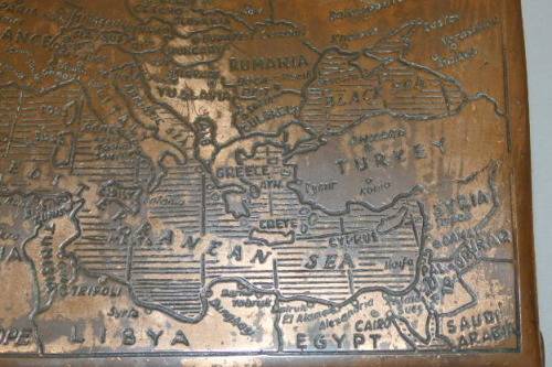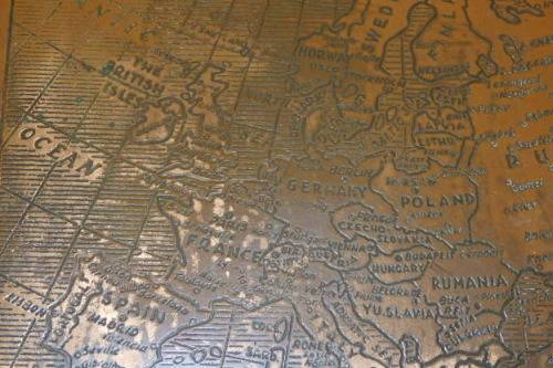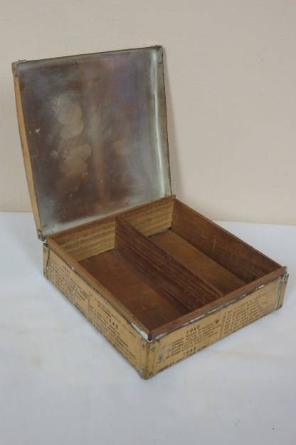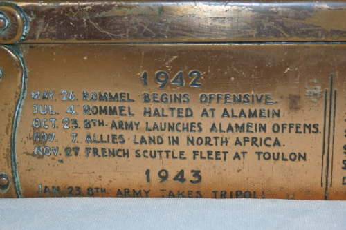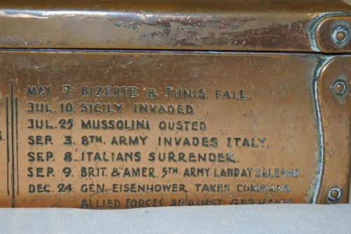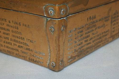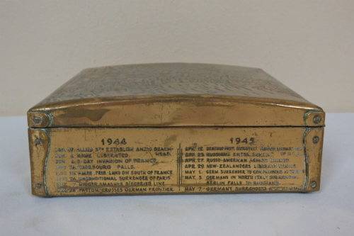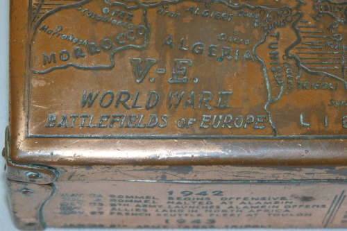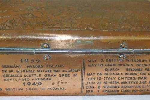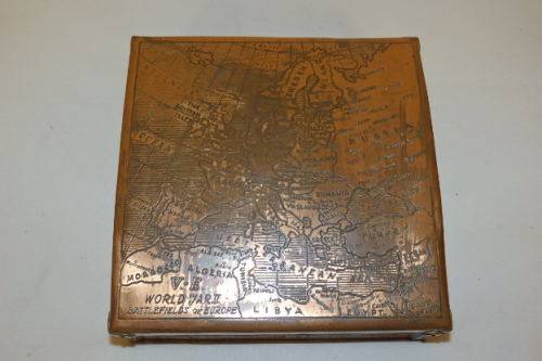 THIS EXCEPTIONALLY RARE VINTAGE "WORLD WAR II - BATTLEFIELDS OF EUROPE" COPPER CLAD CIGAR BOX MEASURES 16.5cm x 16.5cm x 6cm HIGH. A LIMITED NUMVER OF THESE BOXES WERE PRODUCED IN EITHER A SILVER PLATED (ON COPPER) OR STIRLING SILVER CIGAR BOX. THE TOP OF THE CIGAR BOX IS ENGRAVED WITH THE MAP OF EUROPE AND THE SIDES ARE ENGRAVED WITH DATES AND EVENTS THAT OCCURRED THOUGH-OUT EUROPE DURING THE SECOND WORLD WAR. THE BOX WAS INITIALLY SILVER PLATED, BUT THE PLATING HAS MOSTLY TARNISHED EXPOSING THE STUNNING COPPER BASE METAL. THIS IS A VERY RARE FIND AND A MUST FOR ANY WWII MEMORABILIA COLLECTOR.