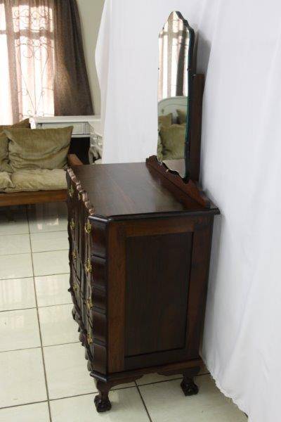 THIS EXQUISITE 4 - DRAWER BALL AND CLAW CABINET / DRESSER IS STUNNING AND COMPLETELY ORIGINAL!!! AN EXQUISITE PIECE OF FURNITURE IN EXCELLENT CONDITION WITH A BEAUTIFUL CURVED MIRROR!!! CHECK THE GRAIN OF THE WOOD - THIS IS STUNNING FURNITURE!!! THE SIZE OF THE CABINET IS APPROXIMATELY 860mm x 500mm x 1620mm HIGH. PLEASE VIEW THE PICS VERY CAREFULLY FOR MORE DETAIL AND THE CONDITION AS THIS FORMS PART OF THE DESCRIPTION; WHAT YOU SEE IS WHAT YOU GET! PLEASE VIEW OUR SHIPPING OPTIONS OR COLLECT IN EDENVALE FREE OF CHARGE!