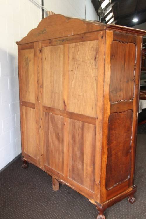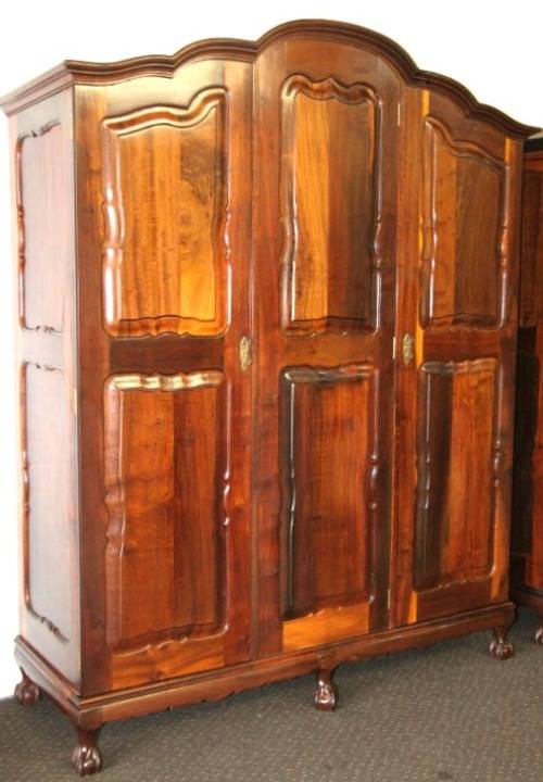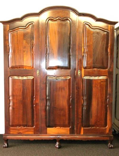 This wonderful gabled three-door solid Imbuia wardrobe with solid brass embellishments and ample packing and hanging space measures a very decent 160,5m long x 57cm wide x 187cm high. The wardrobe is in awesome condition with minimal/ normal age and usage related wear and tear. The wardrobe is very well made and sits well on the ground. The wardrobe features a full length mirror inside the left door. The wardrobe's ball and claw feet and wonderful solid ornate brass embellishments adds that touch of elegance that any room needs. The wardrobe comes with a key to lock the doors. This is a very beautiful and superbly crafted wardrobe that was made to last. Please view the pics carefully to fully appreciate this truly awesome wardrobe and to confirm the condition.