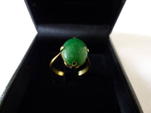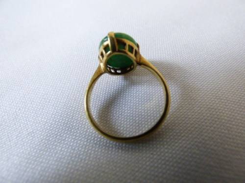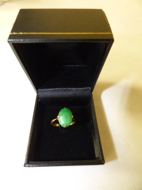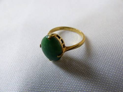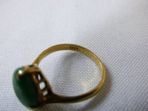 AN EXQUISITE LADIES JADE RING SET IN 18ct GOLD (STAMPED 18CT). THIS BEAUTIFUL RING WILL MAKE A STUNNING GIFT ON A SPECIAL BIRTHDAY, OR TO ADD TO YOUR COLLECTION. IT HAS A TIMELESS ELEGANCE AND WILL NOT DATE. A BEAUTIFUL DAINTY RING!!!