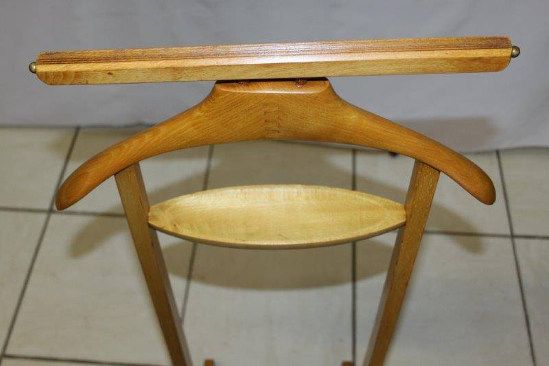 Valet stands can range from the incredibly simple, to the amazingly elaborate. A really simple stand might just have a coat-hanger on top of a pair of legs with three connector-bars at the base to serve as a coat and shoe-stand. A really elaborate valet-stand can come with a coat-hanger, trouser-bar, shoe-rests, compartmentalised jewellery-caddy, tie-bar, hat-stand…even a chair with built-in nick-nack drawer!