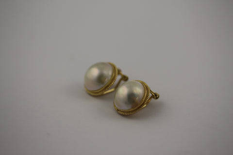 This stylish and very elegant pair of 14ct yellow gold and white Mabe pearl clip-on earrings is a stunning find and are in beautiful condition. Being set in 14ct gold makes it a rarer pair and are the perfect size for a pair of ladies earrings. The combined weight of the Mabe pearl earrings is 4.11g and are roughly 1cm across. The twirled rope detailing around the earrings completes the pair. The earrings are stamped 14K and 585 (14ct gold). This pair of earring would make a stunning gift for a special lady too.