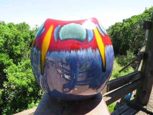An exquisite Poole purse vase. This piece of pottery has been created using "living Glaze". " Living Glaze" involves the application of different glazes which react with one another to achieve the unique result you see. Fine surface crackling is a natural process and the antique effect will continue to develop as the piece matures. EXQUISITE !!!!!!!!!!! Postage R 100.00.