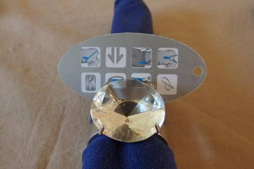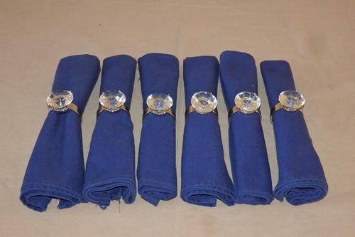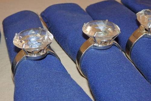 THIS EXQUISITE SET OF SIX SILVER PLATED SERVIETTE RINGS WITH "HUGE" DIAMOND CUT CRYSTALS AND SIX NAVY BLUE WOOLWORTHS FABRIC SERVIETTES ARE IN STUNNING CONDITION AND HAVE ABSOLUTE MINIMAL WEAR AND TEAR. THERE ARE NO CHIPS IN THE CRYSTAL STONE. THE SERVIETTE RINGS ARE MADE TO LOOK LIKE A SOLITAIRE RING AND ALSO HAVE A CLIP FOR A NAME CARD. THE SERVIETTES HAVE A LITTLE USAGE RELATED WEAR AND TEAR.