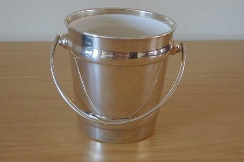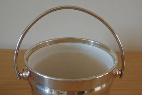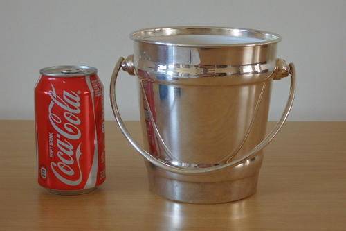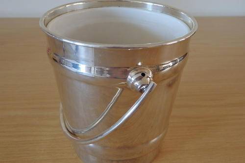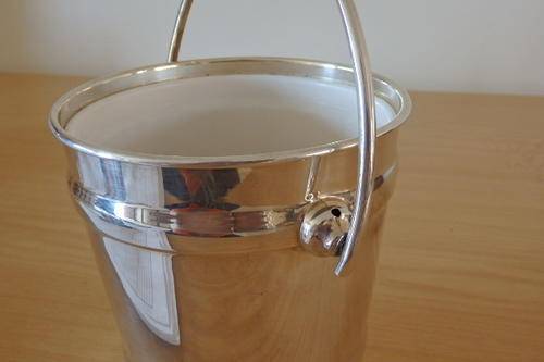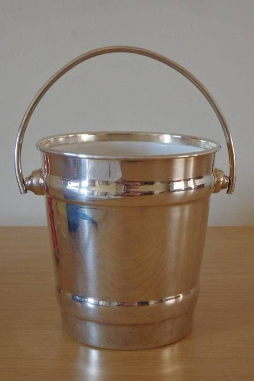 THIS EXQUISITE SILVER PLATED ICE BUCKET WITH A SWIVEL HANDLE AND INSIDE LINING MEASURES 14cm ACROSS THE RIM AND IS 15cm HIGH (EXCLUDING THE HANDLE). THE ICE BUCKET IS A MORE MODERN DESIGNED PIECE AND WOULD LOOK STUNNING ON A DRINKS TROLLEY, A WHISKEY OR BRANDY TRAY OR ON THE BAR. THE ICE BUCKET IS IN GREAT CONDITION AND HAS ABSOLUTE MINIMAL WEAR AND TEAR.