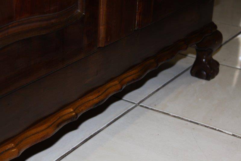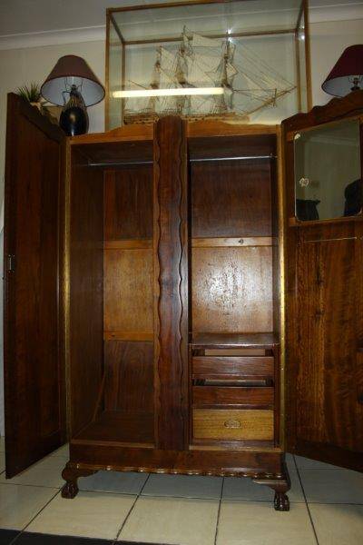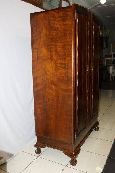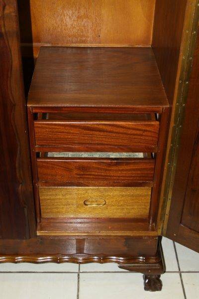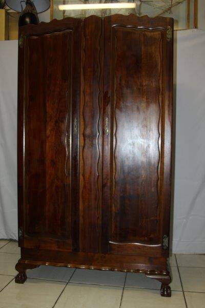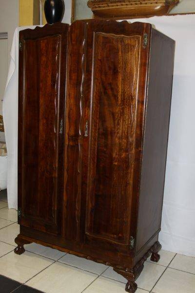 AN EXQUISITE AND DETAILED ORIGINAL OLD IMBUIA OR TEAK (NOT SURE) BALL & CLAW VINTAGE 2-DOOR WARDROBE IN STUNNING CONDITION FOR THE AGE!!! WE FOUND AN OLD NEWSPAPER INSIDE WHICH GIVES SOME INDICATION THAT THIS CUPBOARD CAME FROM Rhodesia AROUND 1966... THE CONDITION & DETAIL IS TOTALLY AMAZING!!! THE SIZE OF THE WARDROBE IS APPROXIMATELY 1050mm WIDE x 560mm DEEP x 1850mm HIGH. PLEASE VIEW THE PICS VERY CAREFULLY FOR MORE DETAIL AND THE CONDITION AS THIS IS VERY MUCH PART OF THE DESCRIPTION; WHAT YOU SEE IS WHAT YOU GET!!! POSTAGE WILL NOT BE POSSIBLE SO PLEASE ARRANGE TO COLLECT IN EDENVALE OR VIEW OUR SHIPPING OPTIONS.