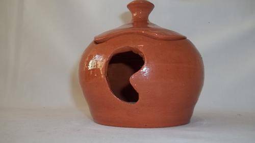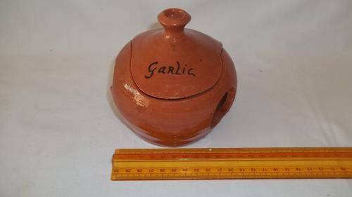 THIS FANTASTIC TERRACOTTA GARLIC HOLDER POT WITH A LID MEASURES 12cm ACROSS x 11.5cm TALL. THE GARLIC POT HAS A CLEAR VARNISH GLAZE TO HELP PROTECT IT AND THERE ARE NO CHIPS OR CRACKS IN THIS AWESOME POT AND WOULD BE FANTASTIC IN A FARM STYLE KITCHEN OR HOME STYLE KITCHEN.