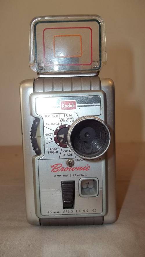 THIS MAGNIFICENT KODAK EASTMAN BROWNIE 8mm MOVIE CAMERA HAS A 13mm f/2.3 LENS AND WEATHER ADJUSTER DIAL. THE MOVIE CAMERA WAS MANUFACTURED BETWEEN 1956 AND 1960. THE CAMERA IS IN GREAT CONDITION WITH A LITTLE AGE AND USAGE RELATED WEAR AND TEAR AND ALL THE BUTTONS AND ADJUSTERS ARE IN PLACE. WE HAVE NOT TESTED THE MOVIE CAMERA.