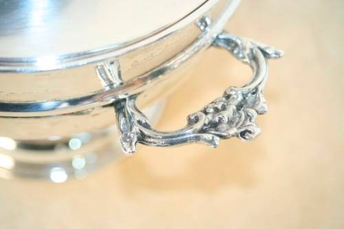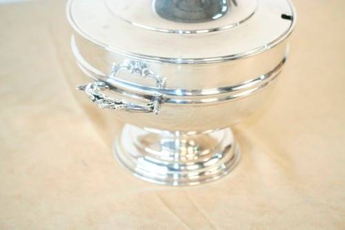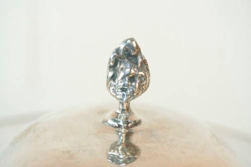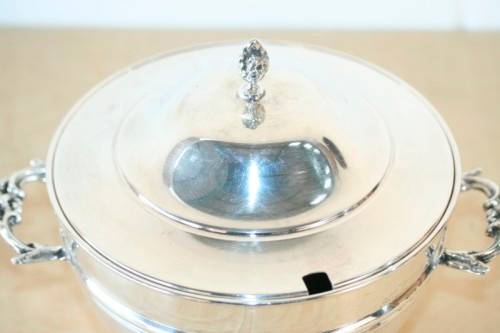 This exquisite vintage "EMESS" silver plated tureen with a slotted lid and beautiful ornate handles is in great condition for its age and measures 30cm long (handle to handle) x 21cm wide x 22cm high (including the lid). The tureen would look amazing on a dinner table with a hot home made soup or broth or even in summer with a chilled soup. The awesome stemmed design makes it a classic piece that would look amazing on a more formal dinner table or buffet. Please view the pics carefully to fully appreciate this stunning silver plated lidded tureen and to confirm the condition.