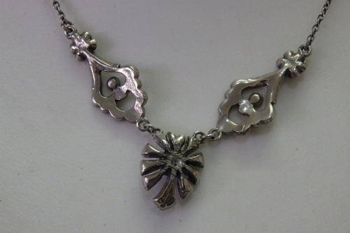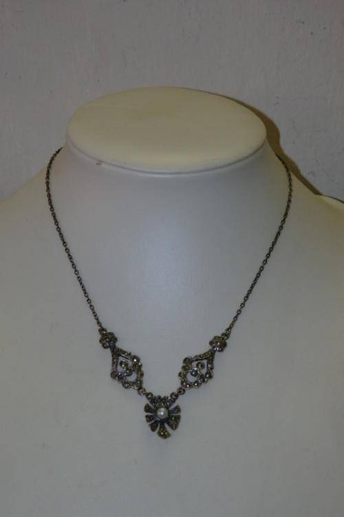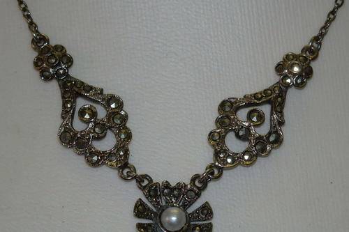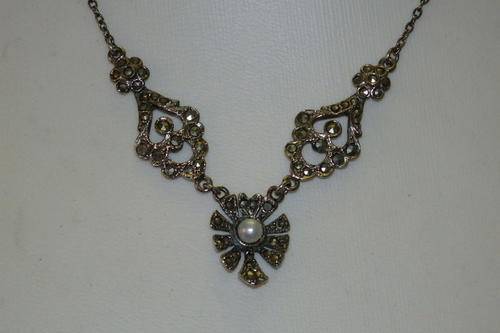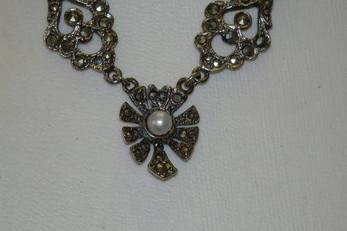 THIS EXQUISITE AND INCREDIBLY ELEGANT VINTAGE LADIES CHOKER AND PENDANT SET WITH MARCASITE STONES AND A CENTRE PEARL IS DISPLAYED IN A GIFT BOX AND THE CHOKER MEASURES 39cm IN LENGTH. THE CHOKER IS VERY REMINISCENT OF ART DECO PIECES FROM THE 1920's TO THE 1940's. THE PENDANT AND CHAIN ARE ONE UNIT. THIS BEAUTIFUL CHOKER WOULD BE AN INCREDIBLE GIFT FOR THAT SOMEONE SPECIAL THIS FESTIVE SEASON.
