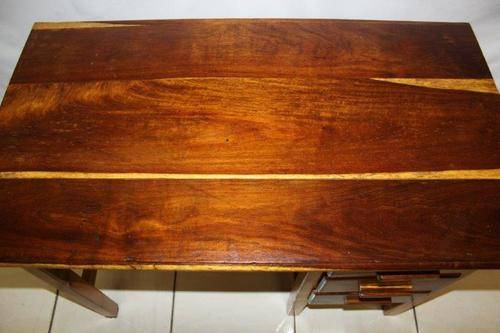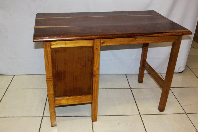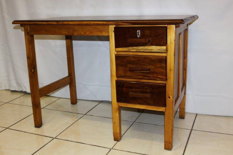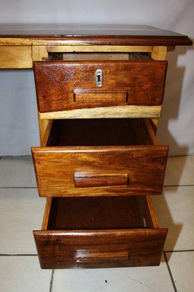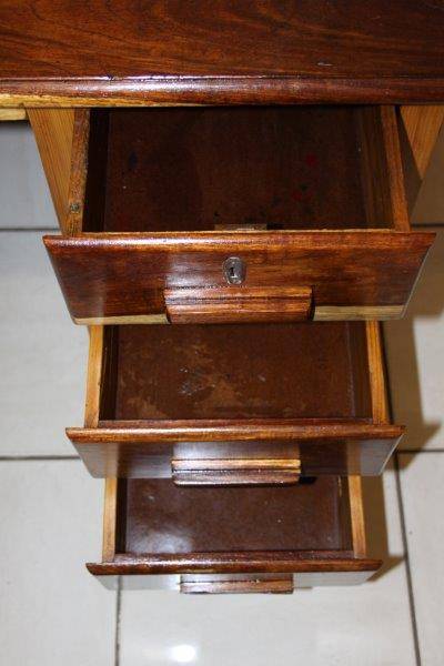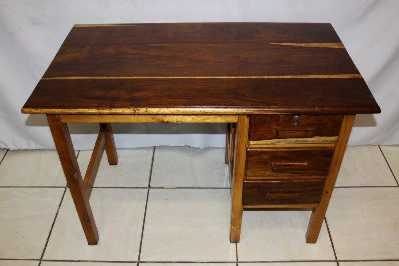 THIS BEAUTIFUL VINTAGE SOLID KIAAT DESK WITH 3 DRAWERS IS EXQUISITE AND IN BRILLIANT CONDITION FOR THE AGE!!! IT IS VERY WELL LOOKED AFTER; STURDY AND VERY VERY BEAUTIFUL! THE DESK IS APPROXIMATELY 1060mm x 600mm x 740mm HIGH. THIS IS PERFECT FOR A SMALLER SPACE OR PERHAPS AS A STUDY TABLE! PLEASE VIEW THE PICS VERY CAREFULLY FOR MORE DETAIL AND TO APPRECIATE THIS BEAUTIFUL PIECE OF FURNITURE!!! TAKE NOTE OF THE BOTTOM DRAWER HANDLE. POSTAGE WILL NOT BE POSSIBLE SO PLEASE COLLECT IN EDENVALE FREE OF CHARGE OR WE CAN DELIVER. PLEASE SEE OUR SHIPPING!
