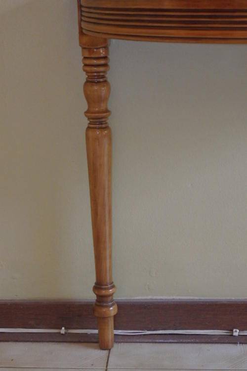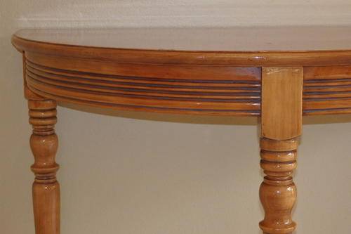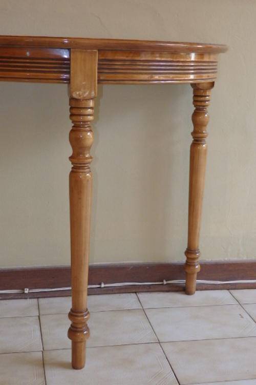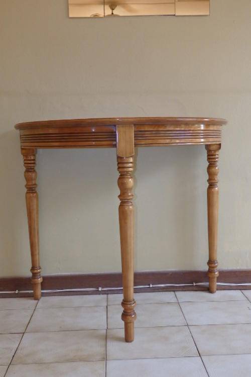 THIS EXQUISITE WOODEN HALF MOON TABLE IS REALLY VERY BEAUTIFUL AND VERY COLLECTIBLE!!! THE DETAILING IS STUNNING AND THIS IS TRULY A MAGNIFICENT PIECE OF FURNITURE IN STUNNING CONDITION!!! PLEASE VIEW THE PICS VERY CAREFULLY FOR MORE DETAIL AND TO APPRECIATE THIS FURNITURE; WHAT YOU SEE IS WHAT YOU GET! THE TABLE IS APPROXIMATELY 875mm LONG x 475mm DEEP x 755mm HIGH.