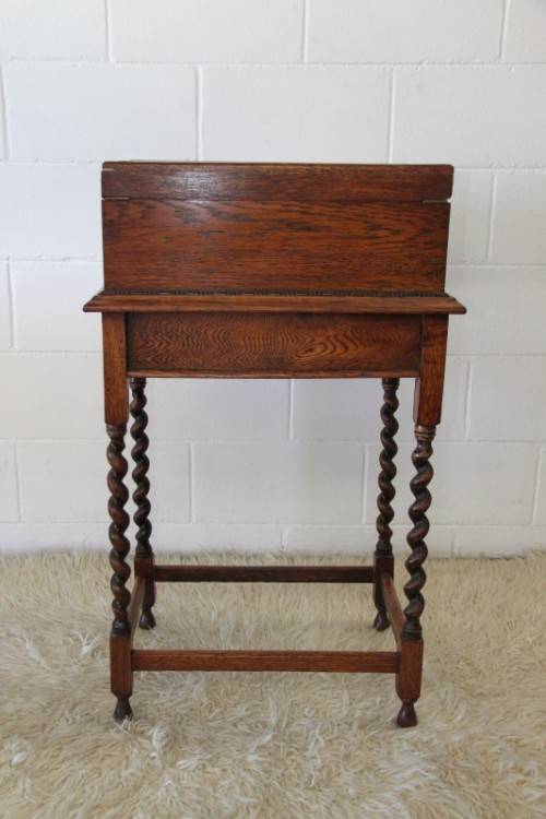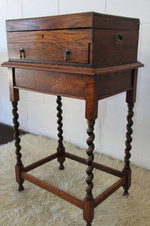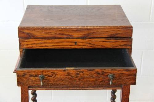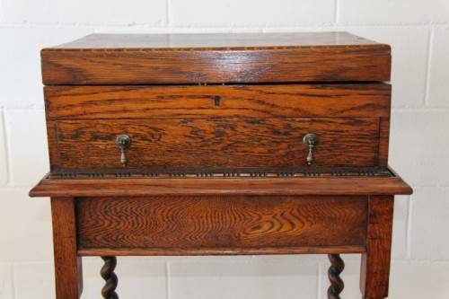This extremely rare antique Victorian Solid Oak cutlery canteen table with a lid that lifts for place for salt & pepper cellars or larger pieces of cutlery, serviette rings etc. measures 55.5cm long x 41cm wide x 92cm high with the stand. Without the stand the canteen measures 50cm long x 36cm wide x 20cm high. The canteen can hold just about any cutlery set including ladles, serving spoons, carving sets, cake forks etc. This beautifully canteen is in great condition with minor age and usage related wear and tear. These table canteens are scarce and were only found in the most "distinguished" homes. Please view the pics carefully to fully appreciate this wonderful rare cutlery canteen and to confirm the condition.