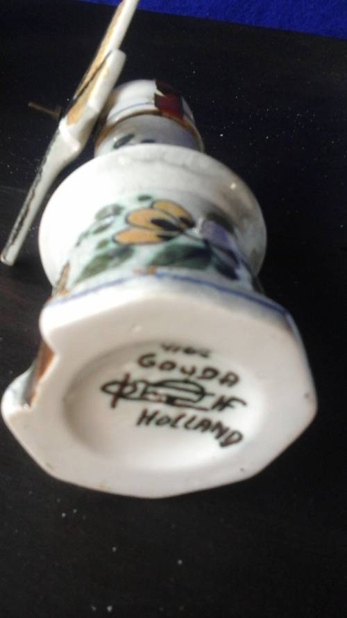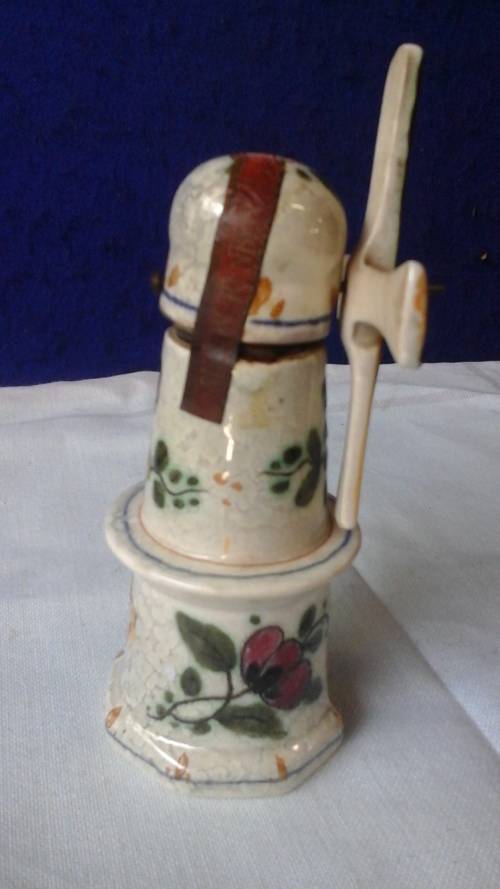 AN EXTREMELY UNUSUAL RYNBENDE'S CHERRY BRANDY LIQUER IN A GOUDA HOLLA CERAMIC WINDMILL DECANTER.