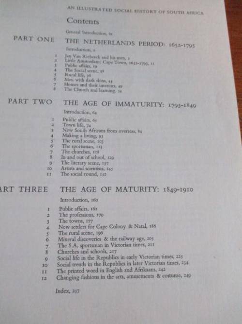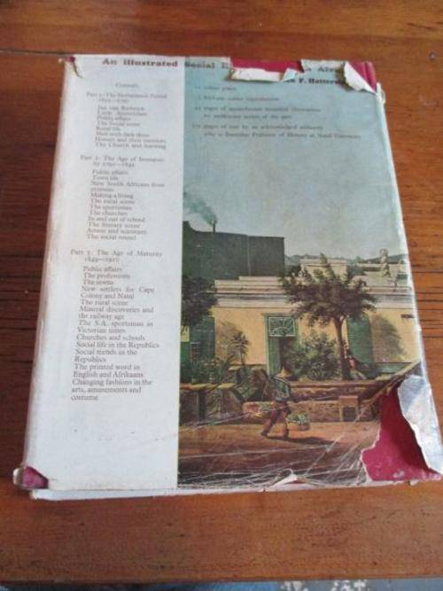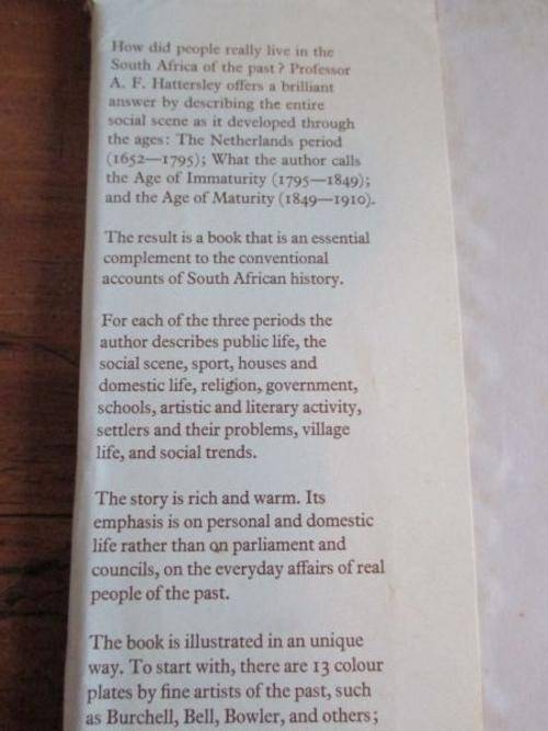 Professor A. F. Hattersley researches the history of how the people lived in South Africa. He describes the entire social scene as it developed through the ages. With 13 colour plates by artists such as Burchell, Bell, Bowler and others, with a fold out colour plate by Langschmidt, of Wale Street, Cape Town, in the 1850's.