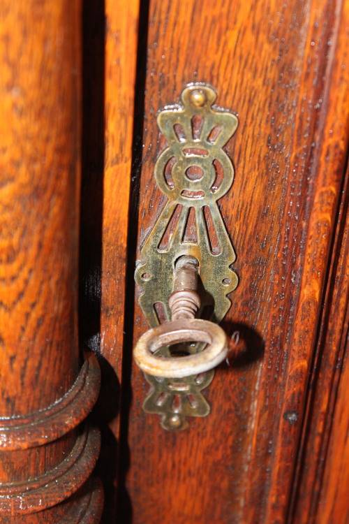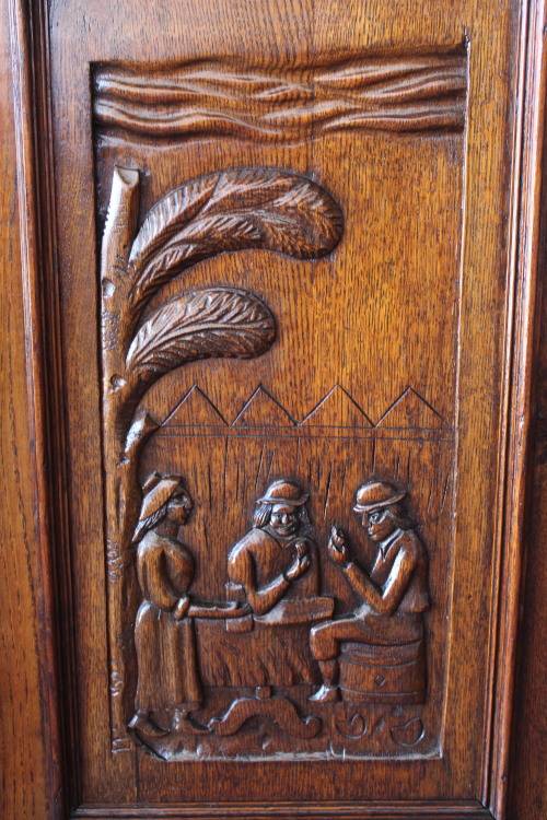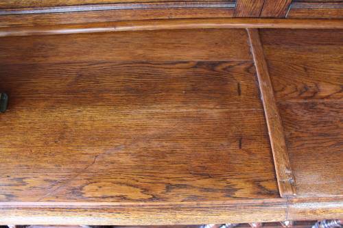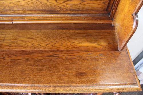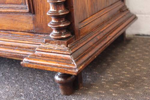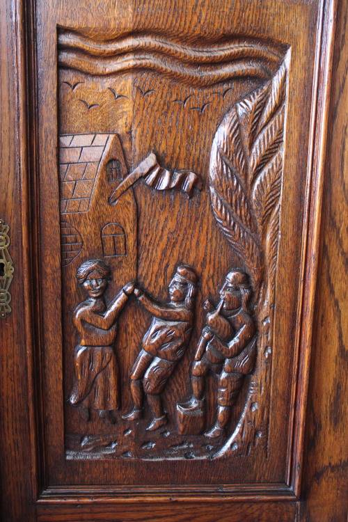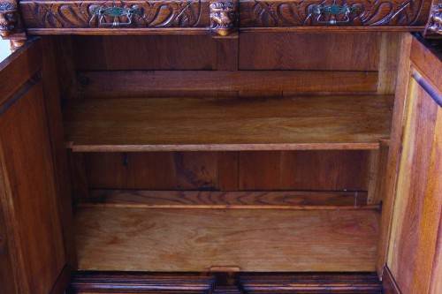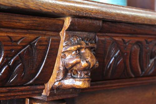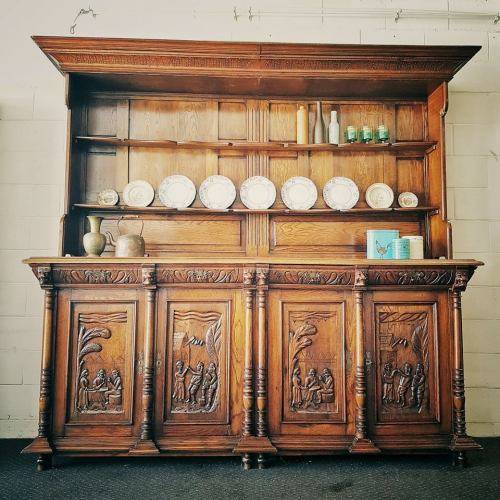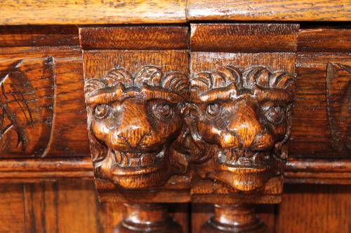 THIS IS SOMETHING TO BEHOLD! This truly spectacular HUGE antique Flemish honeyed Oak 19th century "double" buffet cabinet is in very good condition for its age. The magnificent cabinet measures an extremely decent 237cm long x 53cm wide x 217cm high. The intricately carved detailing is carried through from the top to the superbly carved cabinet doors (which feature turned pillars) and drawers. There are six lion head carvings on the cabinet and the cupboard doors have carved scenes on them. There are two shelves on the top part of the cabinet with grooves to display plates etc. The key for the cabinet is also with the cabinet. The four stunning styled drawers finish off this amazing masterpiece to a "t". The cabinet has some age and usage related wear and tear, but it shows off the age and character of this cabinet - it dates back to around 1870!!. This is by far the largest of these cabinets we have ever seen and also one of the most impressive (it is double the size of a normal buffet)!! Please view the pictures carefully to fully appreciate this amazing antique Flemish buffet cabinet and to confirm the condition.