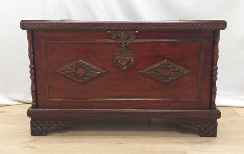 This incredible large vintage solid rosewood ornately carved kist with brass embellishments and felt lined interior is a heavy and well made piece. The kist has hand carved detailing around the lid and on the feet with turned uprights in each of the corners and carved rosettes on the front and sides of the kist. There is also a large removable shelf for smaller valuables. The kist measures 103cm long x 52.5cm wide x 62cm high.