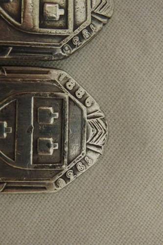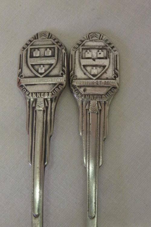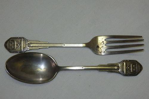 THIS INCREDIBLE AND RARE VINTAGE SILVER PLATED (STAMPED) MAPPIN AND WEBB OF ENGLAND "CITY OF JHB" JUBILEE (1886 TO 1936) COMMEMORATIVE SPOON AND FORK SET ARE STAMPED AT THE BACK AND ARE THE MAPPIN AND WEBB OF ENGLAND "PRICE PLATE" COLLECTION. THE SET HAVE THE OLD JOHANNESBURG COAT OF ARMS DECALS ON THEM. THE SPOON AND FORK SET HAVE AGE AND USAGE RELATED WEAR AND TEAR AND TARNISH, BUT ARE STILL STUNNING COLLECTABLE PIECES WITH AMAZING HISTORY ATTACHED TO THEM. I WAS NOT ABLE TO FIND ONE OTHER SET LIKE IT ON THE INTERNET. HAVE A LOOK AT THE INCREDIBLE ART DECO PATTERN/ DESIGN IN THE SET.