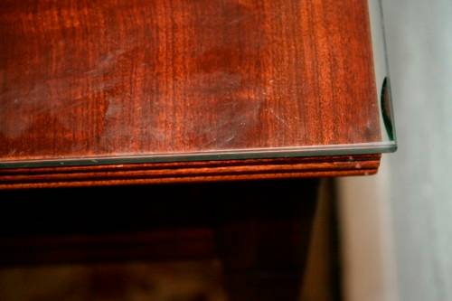 This incredible stylish two-drawer Teak console table with rail inlay detailing and awesome ring handles is in lovely condition. The table has a removable glass protective top. The stylish "curve" front table has two spacious drawers and is on Regency style spade foot legs. The console table measures 115cm long x 47cm wide x 76cm high and would be gorgeous in a living room, entrance hall or hallway. There is a small chip on the back of the glass top (see pic). Please view the pictures carefully to fully appreciate this awesome and stylish inlay console table and to confirm the condition.