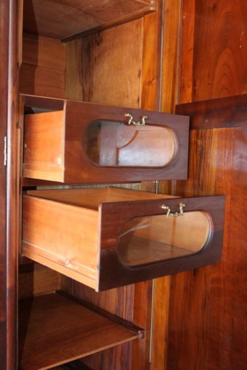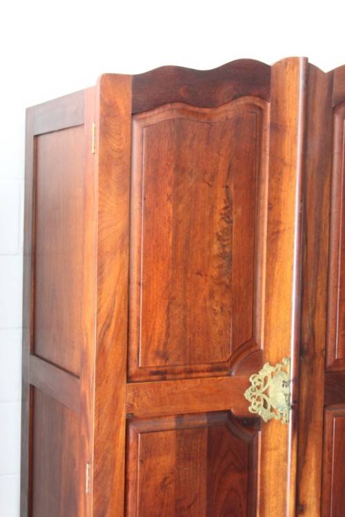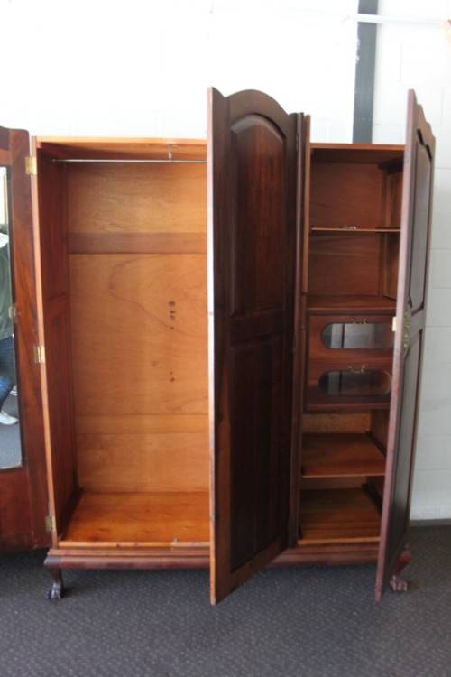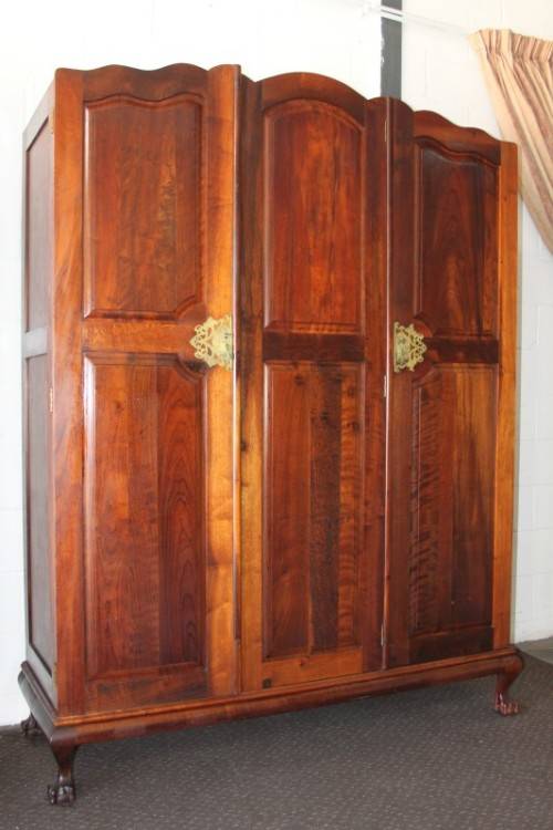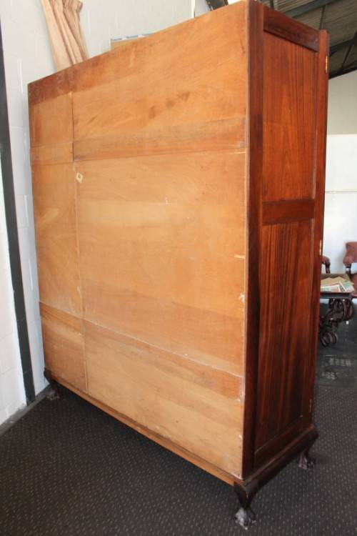 This stunning three-door solid Imbuia wardrobe with solid brass embellishments and ample packing and hanging space measures a very decent 159m long x 56cm wide x 202cm high. The wardrobe is in awesome condition with absolute minimal/ normal age and usage related wear and tear. The wardrobe is very well made and sits well on the ground. The wardrobe also has a tie and belt rail on the door and a full length mirror on the inside of the right door. The wardrobe's ball and claw feet and wonderful solid ornate brass embellishments adds that touch of elegance that would do wonders for any room. The wardrobe comes with two keys to lock the doors. This is a very beautiful and superbly crafted wardrobe that was made to last. Please view the pics carefully to fully appreciate this truly awesome wardrobe and to confirm the condition.